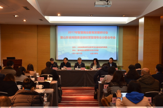 本网讯 (工商管理学院)12月20日,由山东省商指委主办的“2017年智慧商业教育发展研讨会暨山东省商指委连锁经营管理专业分委会年会”在我院举行。全国商业职业教育教学指导委员会副秘书长、山东省商业职业教育专业建设指导委员会秘书长王鑫,全国财政职业教育教学指导委员会委员王鹏,青岛酷特智能有限公司总经理李金柱,山东众邸便利生活有限公司董事长徐增森,全国商业职业教育教学指导委员会委员、山东省商业职业教育专业建设指导委员会副主任、我院党委书记李达,我院副院长宫恩龙以及来自全省16所高职院校连锁经营管理专业的30余位领导与骨干教师、我院全体专业负责人参加了本次研讨会。会议由宫恩龙主持。