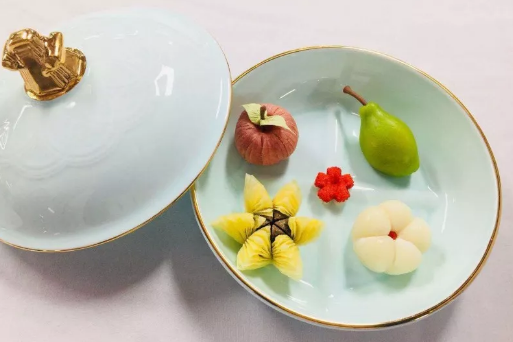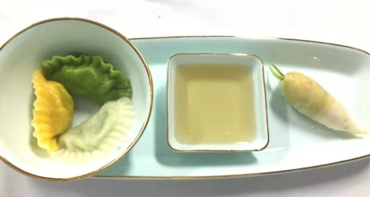 王桂云大师出身面点世家,担任本次国宴面点厨师长。在面点设计上,她充分考虑到营养、外形、颜色、口感和山东元素的结合。在食盒点心设计上采用了面粉和天然蔬菜汁做成了象形小点心,分别是烟台苹果、莱阳梨、济南市花荷花、青岛的市花梅花和耐冬花。三色水饺均采用本地食材,旁边的萝卜酥做成了青萝卜的形状,惟妙惟肖,搭配特制醋汁解腻。