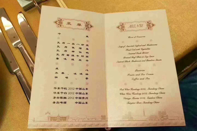 此次宴会主菜为中国八大菜系之首的鲁菜,菜品精选四菜一汤,为了保证所有上桌的菜品色香味俱佳,餐饮团队历时两个多月研发新菜品,每一道菜都做到极致。高炳义是中国烹饪协会名厨委主席、元老级中国烹饪大师,多次担任国宴总指挥、总厨师长,他认为这次宴会整体设计合理节俭,不失高雅和隆重。刘金波是山东省首席技师、青岛市拔尖人才,他认为本次国宴对传统孔府菜进行了改良和创新,体现了对多元文化的尊重,是上海精神的体现。