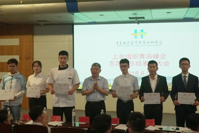 团委书记李柯宣读表彰决定,经学院研究决定,授予旅游与酒店管理学院和烹饪学院为“上合组织青岛峰会优秀组织单位”,徐彩红等687名志愿者为“优秀志愿者”。