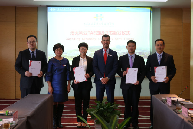本网讯(国际交流与合作处 邵常恩)4月15日,澳大利亚南澳技术与继续教育学院副校长布莱特·莫哈尼、全球战略发展总监贾飞霞一行两人访问我院。双方在旅游与酒店管理学院实训中心多功能厅共同举行澳大利亚TAE四级证书颁发仪式。学院党委书记李达、党委副书记于敏、副院长刁洪斌、副院长宫恩龙等出席仪式。