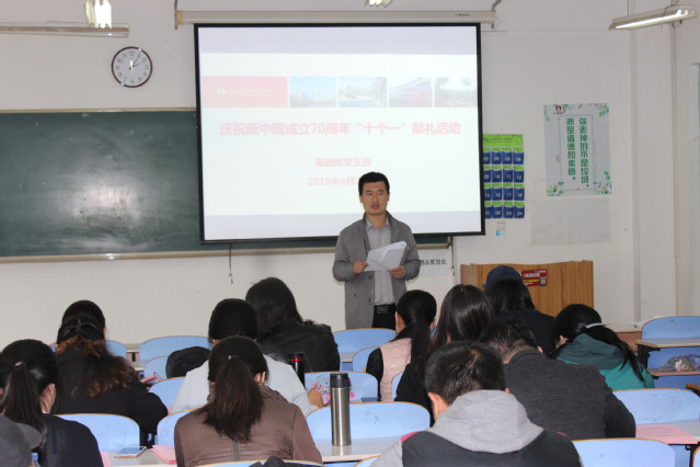 会上,基础教学部主任董瑞虎部署并详细讲解了“十个一”活动具体安排,从五月到十二月,要组织一次以庆祝新中国成立70周年为主题的实地考察、开展一次以新中国成立七十周年为主题的专题教育、开展一次“我眼中的祖国”摄影大赛、各教研室录制一部视频短片、观看一部爱国主义影片、在学生中组织一系列爱国主义讲座、每位教师阅读一本红色书籍、写下一个工作上的新目标、结合课程思政在课上讲一个红色故事、为农村贫困学生捐出一本好书等。