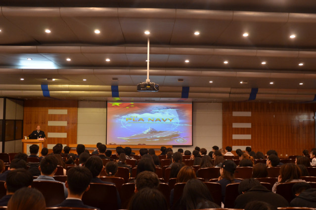 吕世平教授以“维护海洋权益,建设强大海军”为题为是师生们讲授了一场爱国主义讲座。他从人民海军发展历程,我国维护海洋权益和建设海洋强国面临的挑战,维护海权成就、展望未来任重道远等三个方面展开。吕世平强调“面向海洋则兴,放弃海洋则衰”,只有加强战略思想,才能在有限的基础上创造无限的可能,才能实现中华民族的伟大复兴梦。