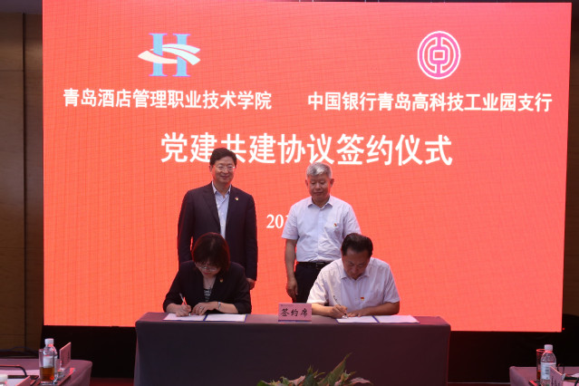学院党委书记李达,党委副书记于敏,副院长王建宝,副院长刁洪斌,纪委书记姜玲玲,中国银行青岛市分行纪委书记付连晔,中国银行青岛市分行党务工作部部长谢其善,中国银行高科园支行副行长朱雨顺,中国银行高科园支行纪委书记宋萍出席签约仪式。