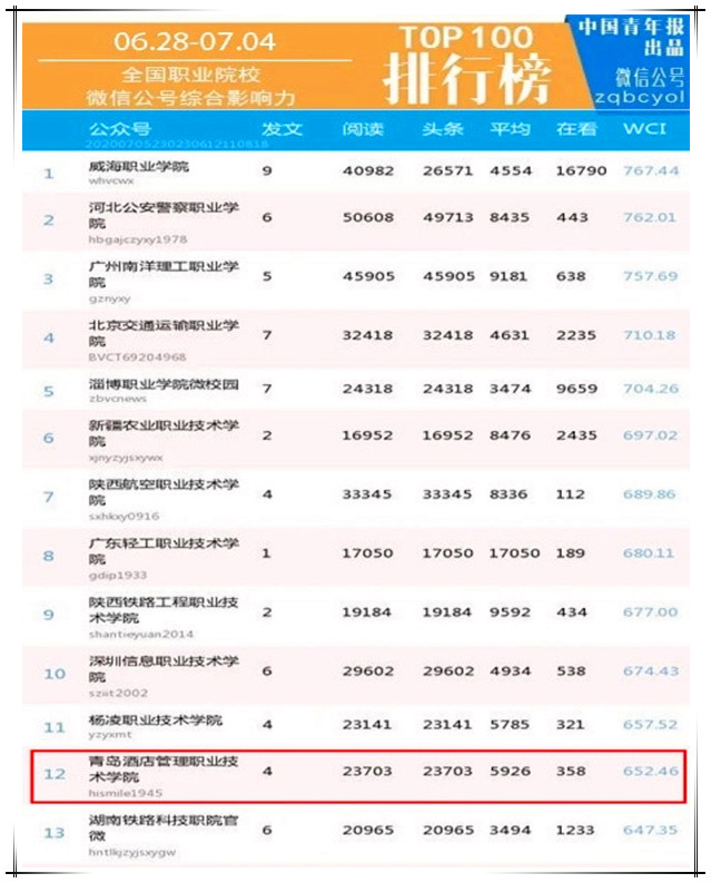 本网讯(宣传统战部 李代玉)7月6日,在中国青年报出品的《全国普通高校微信公号排行榜[6.28-7.4]》中,学院官方微信公众号“威尼斯WNS9778(hismile1945)”综合影响力位列全国职业院校第十二位,四篇推文全部进入全国职业院校单周文章阅读量top100排行榜。