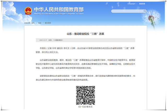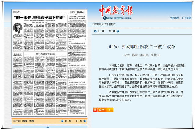 本网讯(宣传统战部)10月27日,《中国教育报》在第三版(要闻)以《山东:推动职业院校“三教”改革》为题,报道学院发起成立山东职业院校“三教”改革联盟,中华人民共和国教育部官网进行全文转载。