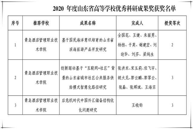 本网讯(科研发展处 刘淑青)近日,山东省教育厅公布了2020年度山东省高等学校优秀科研成果奖获奖名单。学院共有3项成果获评为人文社会科学优秀成果奖,其中二等奖1项,三等奖2项。具体名单如下表: