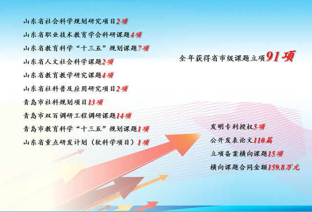 获得省市级课题立项91项,在山东省社会科学规划研究项目、山东省教育科学“十三五”规划研究项目、青岛市社科规划项目、青岛市双百调研工程调研项目、山东省重点研发计划(软科学项目)等实现质与量的突破。荣获山东省优秀科研成果3项,青岛市教育科研成果1项,青岛市第34次社科成果奖3项。公开发表论文110篇,获得发明专利授权5项。立项横向课题15项,合同金额159.8万。