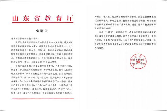 信中表示,2020年山东省作为全国职业院校技能大赛改革试点的唯一赛区,承接了全部37个试点赛项。学院作为大赛承办院校,认真落实地方政府背书、以职业院校为主体的申办新机制,在全院师生的共同努力下,以“倒计时”的工作状态,扎实做好各项筹备和服务保障工作,为来自全国各地的参赛团队提供了良好条件,展现出严谨专业的工作水准和“好客山东”良好形象。大赛各项工作安全有序、平稳顺利、精彩纷呈,取得圆满成功,达到了“安全、质量、公平、廉洁”的办赛目标,为建立体现世界技能大赛理念、开放式、普及性、线上线下相结合的新赛制,为国家层面整体推进这项规模最大、影响力最强、技能水平最高的全国性、综合性职业院校技能赛事改革作出了重要贡献。