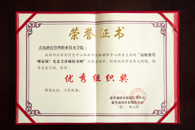 本网讯(党委宣传统战部)近日,在新华社新闻信息中心和新媒体中心联合主办的“高校食堂哪家强?光盘美食喊你来晒”征集活动中,学院荣获“优秀组织奖”。