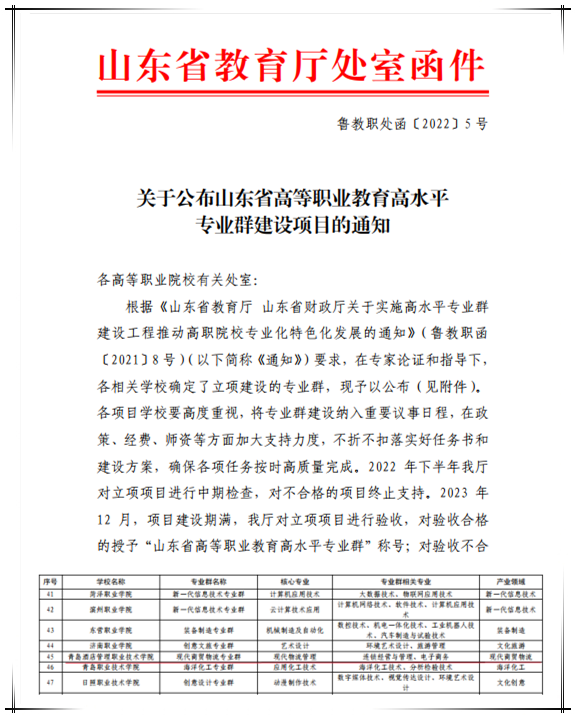 本网讯(教务处 工商管理学院)近日,山东省教育厅公布了《山东省高等职业教育高水平专业群建设项目的通知》(鲁教职处函〔2022〕5 号),我校现代商贸物流专业群立项,这是继旅游接待业专业群、烹饪类专业群之后,学校获批立项的第三个省级高水平专业群。