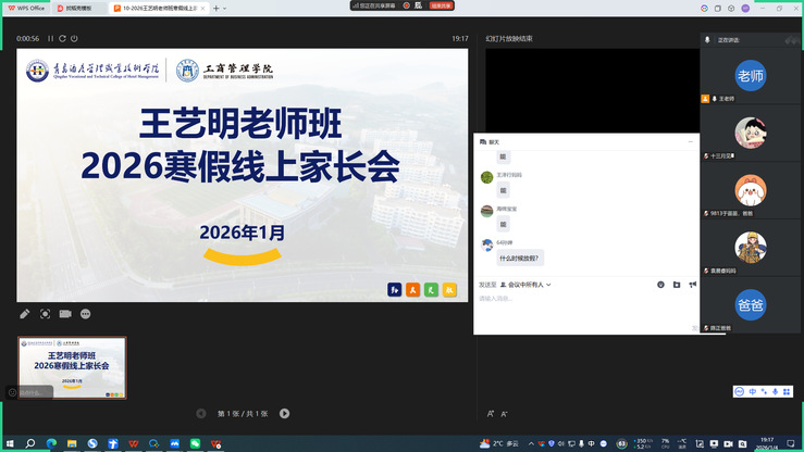 寒假放假前夕,学院分年级召开了线上学生家长会。会上,辅导员向与会家长详细介绍了学校八十年的办学历史、发展成就及工商管理学院的专业特色,以增进家长对学校文化的认同感。针对寒假期间的关键节点,会议重点围绕“安全”与“学业”两大主题展开。辅导员结合具体案例,着重强调了假期交通安全、消防安全及防范电信网络诈骗等事项,明确了家长的监护责任。同时,针对不同年级学生的学习特点,老师们分析了就业和学业情况,建议家长督促学生合理规划假期时间,确保假期学业“不掉线”。